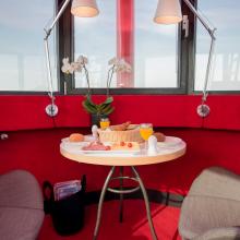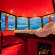 Zo’n tachtig treden leiden naar de top. Daar kronen drie zeer compleet uitgeruste verdiepingen het imposante kunstlicht. Bij binnenkomst is er gelijk de badkamer met ronde doucheruimte die via een gebogen gangetje toegang geeft tot de torenkamer, het belangrijkste woongedeelte. Hier bevindt zich het op maat gemaakte bed, de kleine zithoek en een werkblad met alle faciliteiten die uitgebreid ontbijten mogelijk maken. Via een steile trap wordt het lichthuis onder de koperen koepel bereikt. Van daaruit is de omloop te betreden, deze loopt rondom het lichthuis.