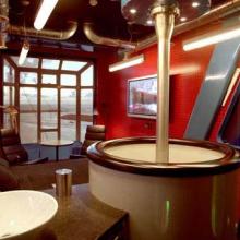 In de cabine staat één stoel, met één knuppel waarmee u de kraan driehonderdzestig graden kunt laten draaien. Je kunt je eigen panorama kiezen; dag en nacht. Verder is er op het dak een terras gemaakt met daarom heen een reling.